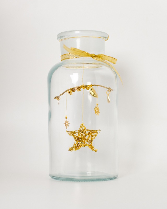 透過刺繍の技法で制作した 小さな手のひら大サイズのクリスマスツリーのオブジェです。 深いグリーンの糸に、星のきらめきのような ゴールドのビーズを丁寧に散りばめました。 サイズ:高さ 約8.5cm(瓶:直径 約5cm) 仕様:ガラス瓶上部から吊り下げ/手縫い一点もの 素材:糸、ビーズ、ガラス瓶 ほか 技法:透過刺繍 販売:クリスマス限定 ※簡易ラッピングとしてリボンをお掛けしてお届けいたします。 ⸻ ✧ 発送について ・発送予定:11月26日 ・12月1日以降より時間指定可能 ・一点もののため、交換はご遠慮ください